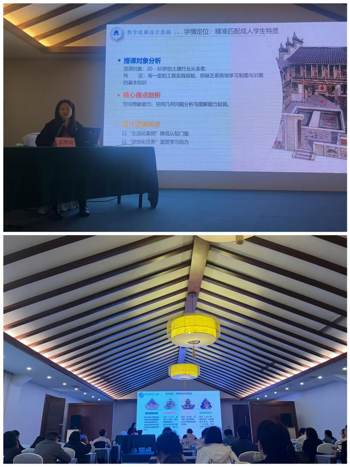 当日下午,宁夏开放大学土建类专业教师武辉皎聚焦土建类基础课程教学创新,以“以境促学,以玩促练:建筑制图基础教学实践探索”为题作分享重点突出AI技术在教学中的创新应用。针对土建类专业学生学习建筑制图时空间想象能力薄弱、学习兴趣不足等痛点,武辉皎老师介绍了团队打造的“AI+教学”新模式:通过AI数字人讲述建筑制图相关历史故事,生动导入课程内容;借助AI技术设计“大富翁闯关”等互动游戏,将抽象的制图知识转化为趣味化练习;帮助学生快速理解空间结构。为全国土建类专业基础课程教学改革提供了可借鉴的实践经验。