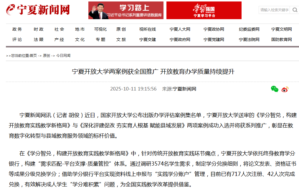 近年来,宁夏开放大学持续深化教学改革,聚焦传统开放教育实践环节存在的难点,依托终身教育学分银行,构建起“需求匹配—平台支撑—质量管控”的实践教学体系。通过调研学生需求、制定学分兑换细则,将论文发表、资格证书等成果分级兑换学分,如“三网”检索论文可兑换毕业论文5学分,参加专业相关活动并获奖可兑换实践环节3学分此项改革有效解决了成人学生“学分难积累”问题,为全国实践教学改革提供了有益借鉴。其《学分智兑 构建开放教育实践教学新格局》案例已入选国家开放大学评估案例集为全国开放教育实践教学改革提供可复制、可推广的经验。