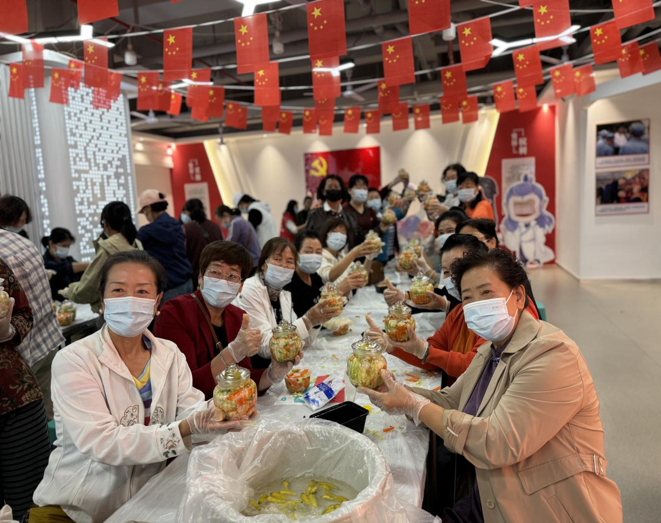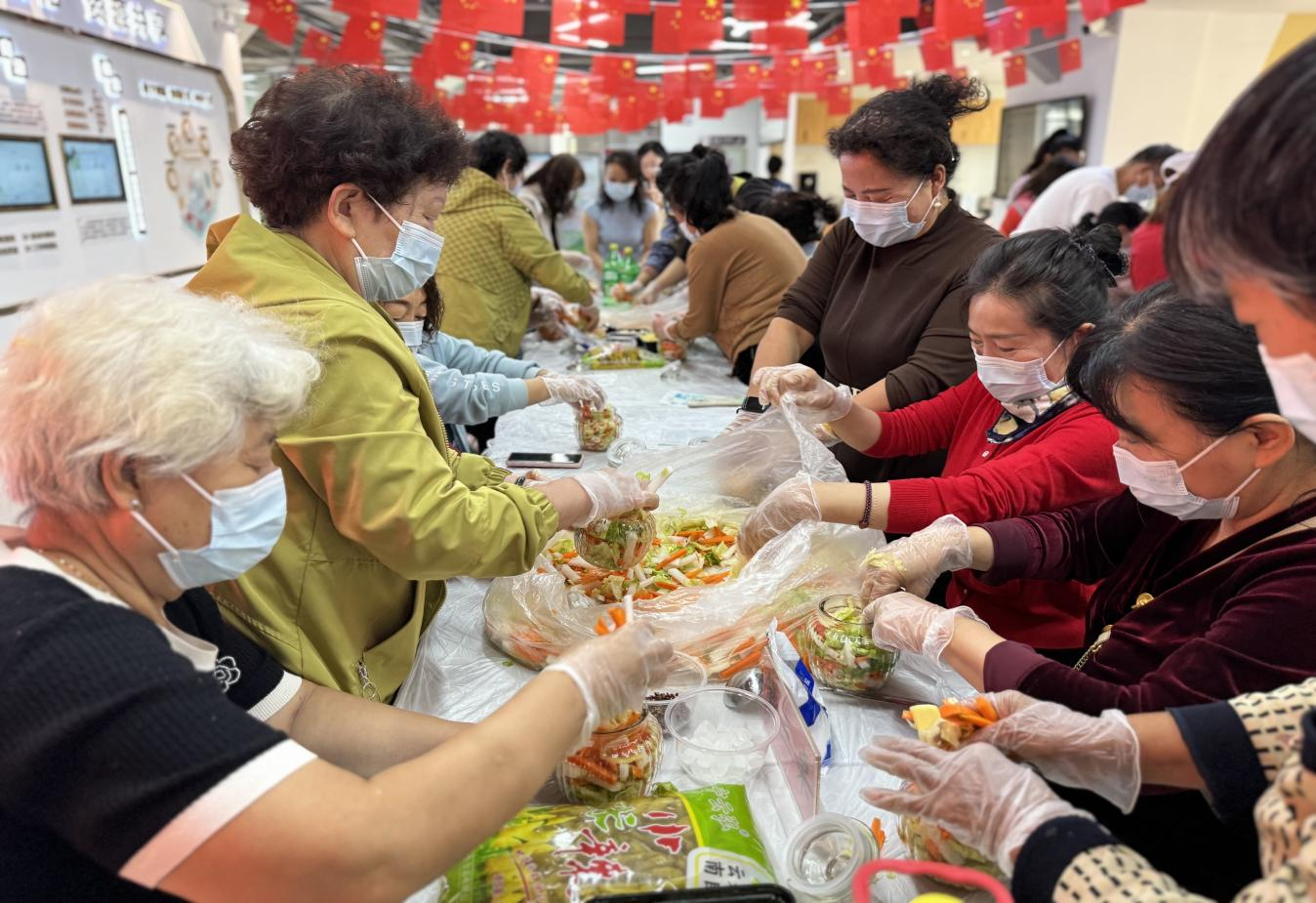 经典诵读过后,泡菜制作环节正式开启,社区早已为100余位参与居民精心准备了腌制泡菜专用玻璃坛、新鲜水灵的蔬菜以及品种齐全的调味品,从清脆的莲花菜、爽口的萝卜到香醇的辣椒、提鲜的大蒜,每一份食材都承载着社区对居民的关怀,更蕴含着“各民族共享幸福生活”的美好愿景。