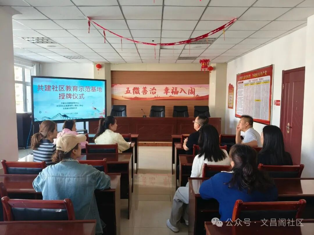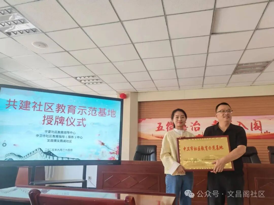 为进一步深化社区教育内涵,增强社区凝聚力,推动全民终身学习体系落地,9月24日,宁夏开放大学、宁夏社区教育指导中心与中卫学院联合开展社区教育示范基地授牌仪式,文昌阁社区成为中卫市第3个社区教育示范点。中卫市职业技术学校党委委员张卫平、成人教育科科长李明,文昌阁社区党委书记、主任张盈春等出席仪式。