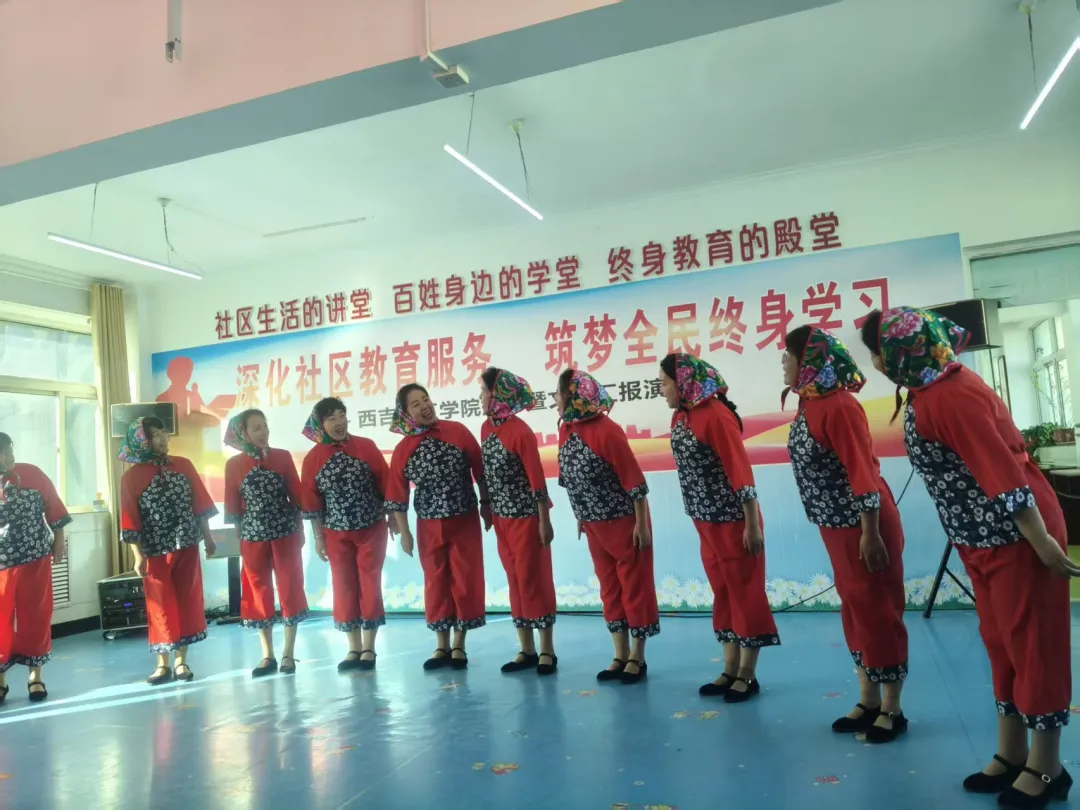 挂牌仪式后,文艺汇报演出精彩上演,为现场观众带来了一场视听盛宴。社区居民自编自导的舞蹈《在希望的田野上》展现了新时代居民的精神风貌;老年学员诗朗诵《读中国》旋律激昂,传递出浓浓的家国情怀;节目《回娘家》,诠释了社区居民的亲子共育理念;戏曲表演展现了民间戏曲的深厚底蕴,非遗传承人带来的剪纸技艺展示与书法展示相映成趣,彰显了传统文化的独特魅力。整场演出节目形式多样、内容丰富,既有专业水准,又饱含生活温度,赢得台下阵阵掌声,充分展现了西吉社区居民的文化素养与精神风采。