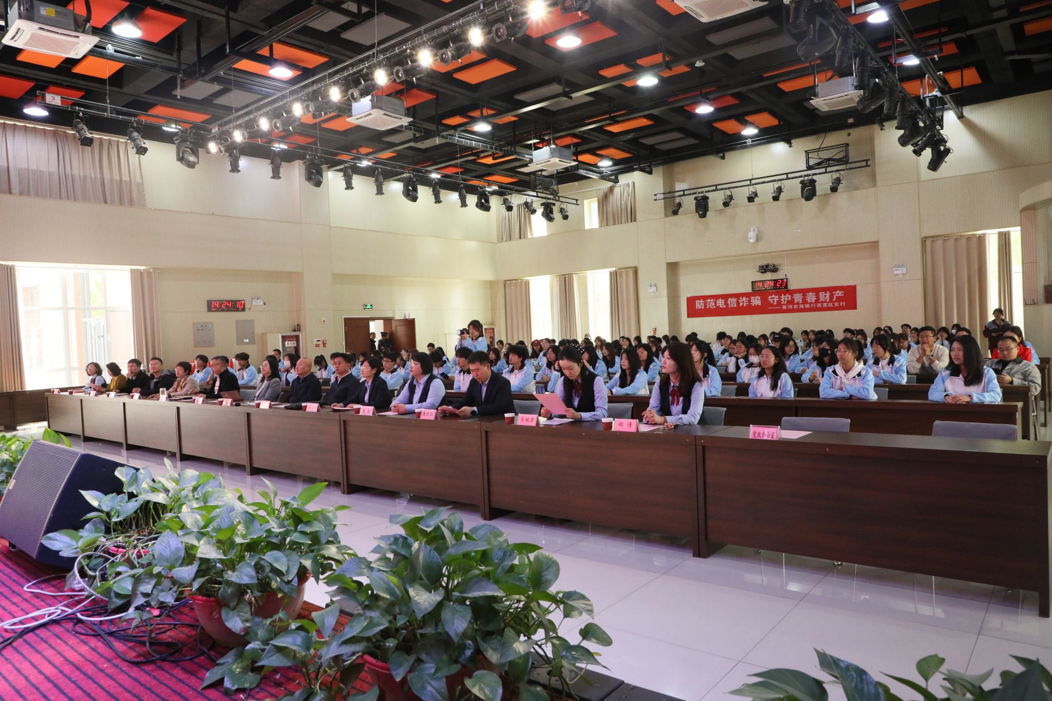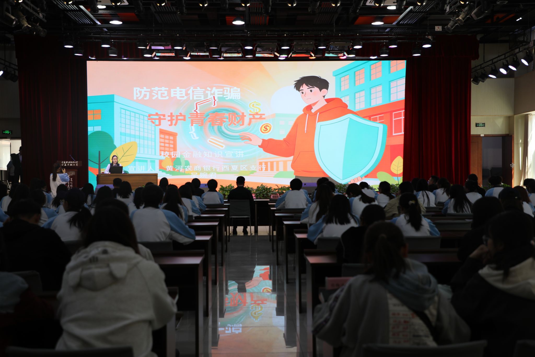 黄河农商银行西夏区支行业务主管吴婉君作《防范电信诈骗 守护青春财产》宣讲。她揭秘网络刷单、虚假贷款、冒充客服、注销“校园贷”等常见手法,重点介绍“跑分”“两卡”买卖等新型犯罪形式,剖析“低息”“秒到账”背后的陷阱,并传授“三不一要”防范技巧(不轻信、不透露、不转账、要及时报案),指导师生安装“国家反诈中心”APP,其实用建议赢得现场阵阵掌声。