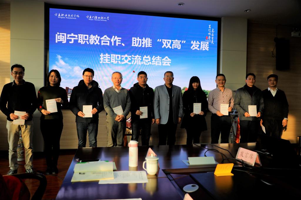 会上,焦玉柱副校长通报了闽宁教育协作情况;福建船政交通职业学院汽车运用工程系党总支书记蔡华锦汇报了一周的学习工作情况,分享了在挂职期间的感悟和收获,刘炜校长为福建船政挂职教师颁发了继续教育证书。随后,两校挂职人员代表结合各自专业和从事领域畅谈自己挂职期间的所学所见所闻所感所思和挂职收获以及挂职对今后工作的帮助。大家纷纷表示,通过挂职,收获颇丰,感受到了学校的热情接待和丰厚的文化底蕴,开拓了眼界,丰富了阅历,积累了经验,对所从事的工作岗位也有了新的认识和思考,今后,将进一步在闽宁职教合作、校企合作、“双高建设”、科研申报等领域加强沟通、交流与合作,加深两校情意,促进两校更好更快发展。