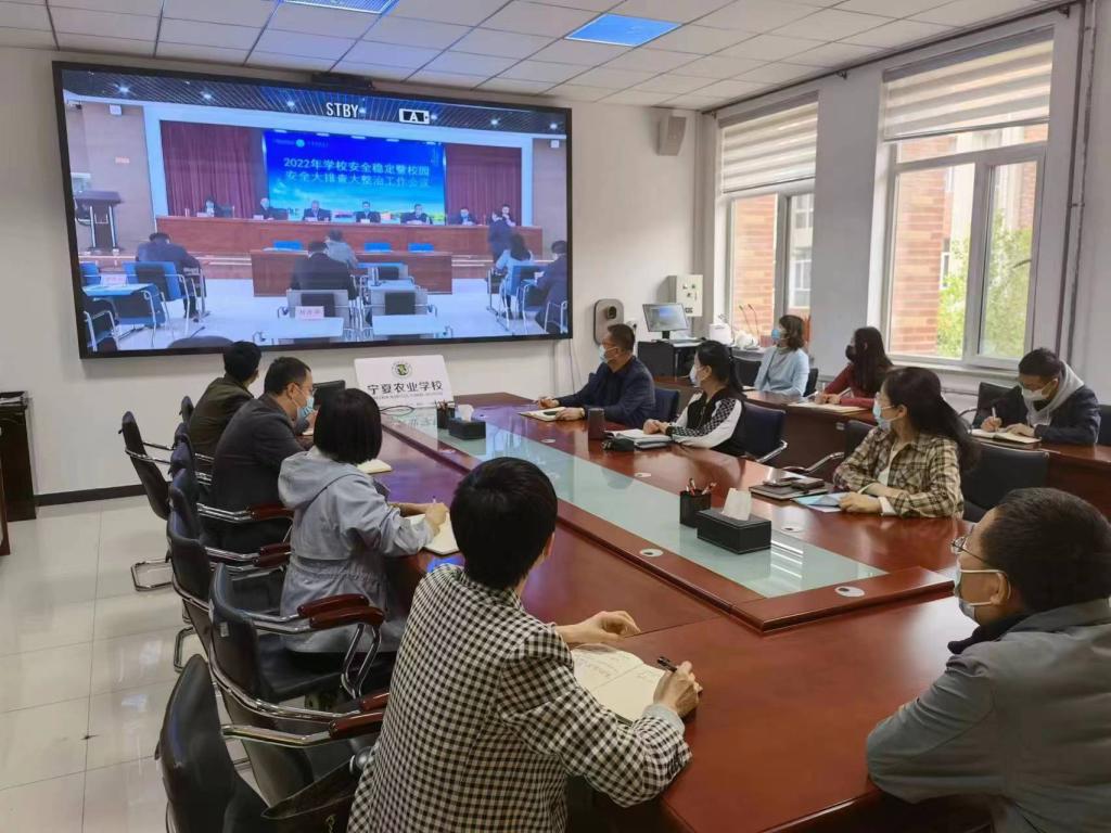为认真贯彻习近平总书记关于校园安全稳定工作的重要指示精神,全面落实党中央、国务院、教育部、自治区党委政府和教育厅关于校园安全稳定工作的决策部署,切实维护好校园的安全稳定。4月27日,学校召开校园安全大排查大整治工作会议,安排部署学校安全稳定工作和校园安全大排查大整治工作。校领导赵利宁、刘炜、苏晓军、张桓、马元、陈志勇、陈灿及各部门、各院(系)、宁夏农业学校党政负责人参加了此次会议。会议由党委书记赵利宁主持。