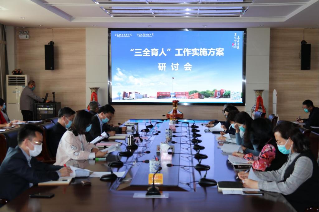 最后,赵利宁书记作了总结讲话。他指出,“三全育人”工作是党中央、教育部、自治区部署的新时期高校思想政治工作的重要抓手,是我校落实立德树人根本任务的重要举措。他强调,一是要进一步统一思想,提高政治站位。要把党中央、教育部、自治区关于“三全育人”工作的精神吃透,把立德树人的根本任务作为学校“三全育人”工作的出发点;把培养德智体美劳全面发展的社会主义建设者和接班人,培养担当民族复兴大任的时代新人,作为学校“三全育人”工作的落脚点;把“四个服务”理念进一步融入“三全育人”工作方案和各项工作举措,以高度的政治责任感和使命感,将我校新的职能定位、新的育人理念与“三全育人”工作有效结合。二是要坚持导向思维,健全一体化育人体系。各部门、院系要加强配合,整合各方力量,全面做好学校育人工作。三是要加强与兄弟单位的沟通联系,在充分结合我校实际的基础上,积极借鉴和学习兄弟单位先进做法和理念。四是实施方案形成的过程中,要实现双项沟通交流模式,各部门、院系要紧密结合自身职能,充分发挥主观能动性,有创新、有亮点、有实效的制定具体实施方案,确保“三全育人”工作形成育人合力,进一步巩固校园育人主阵地。五是各部门、院系制定具体实施方案要符合工作实际,具有可操作性,同时,要把前期宣传动员、培训教育作为“三全育人”工作的重点,要通过此项工作体现各部门、院系自身政治性和思想性。